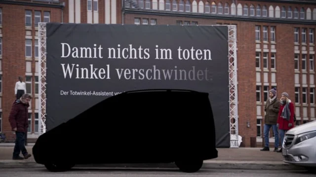 In Deutschland passieren jedes Jahr fast 10.000 Unfälle, weil Fahrzeuge im toten Winkel verschwinden. Nutzfahrzeuge haben einen besonders großen toten Winkel. Der Totwinkel-Assistent von Mercedes-Benz Vans macht den Fahrer auf Gefahren beim Spurwechsel aufmerksam. Aber wie macht man auf den Totwinkel-Assistenten aufmerksam?